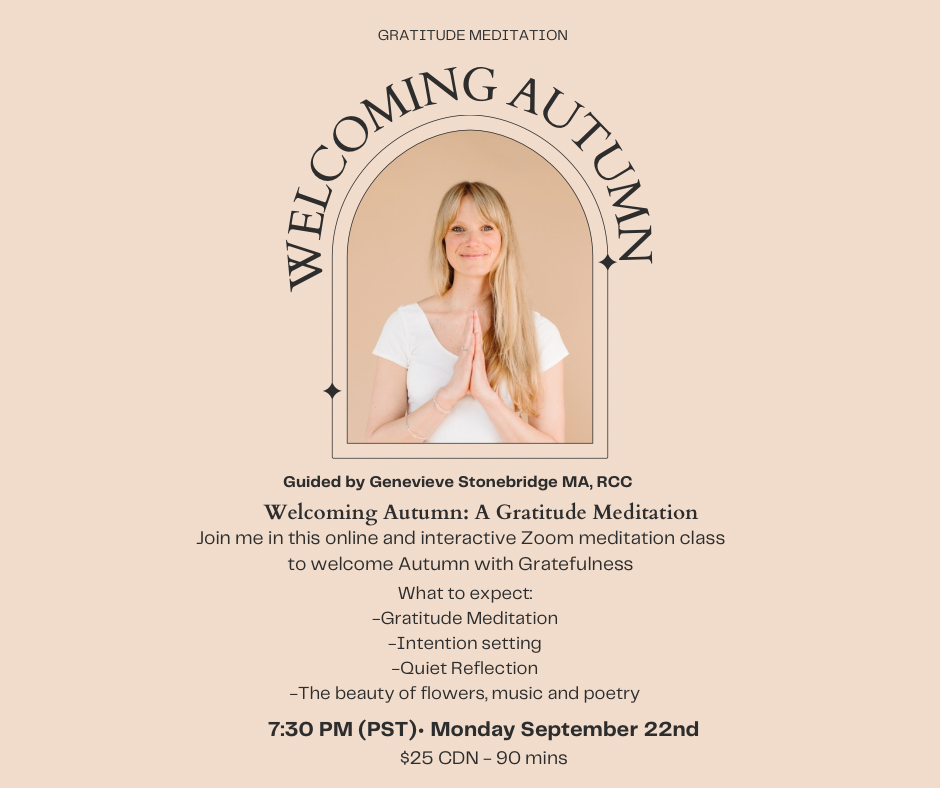 In this class we will take pause in gratitude and meditate together to welcome the season of harvest and going inwards. As the earth celebrates in her bounty and shaking out her leaves we will reflect on the past season of Summer and transition mindfully into the season of Autumn.